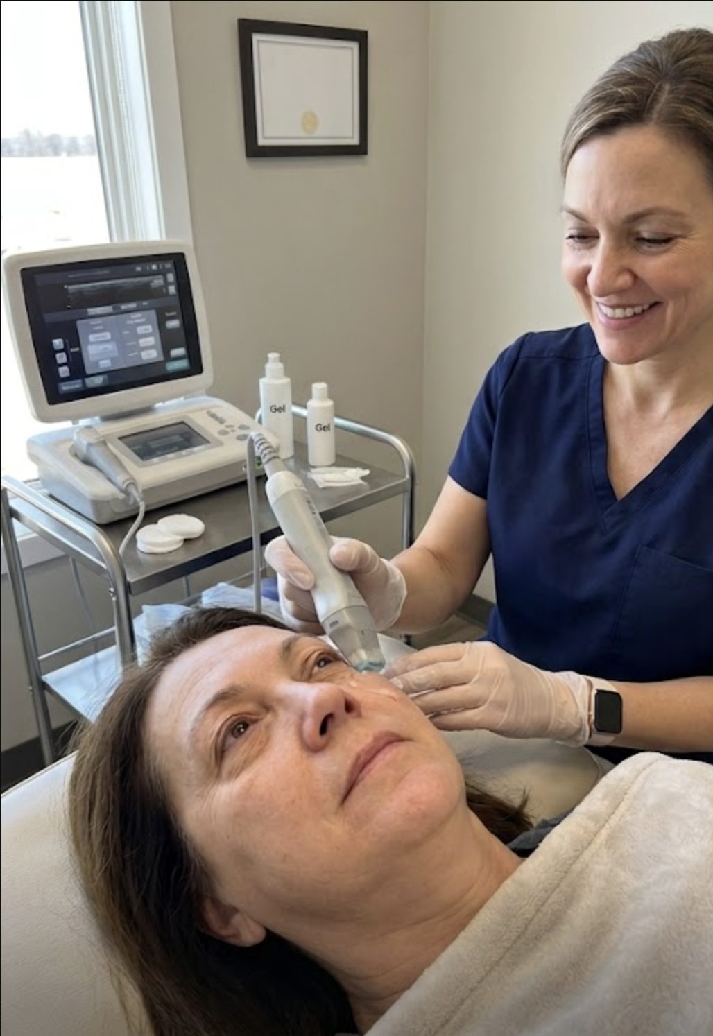 Advanced radiofrequency and ultrasound technology work together to tighten skin,