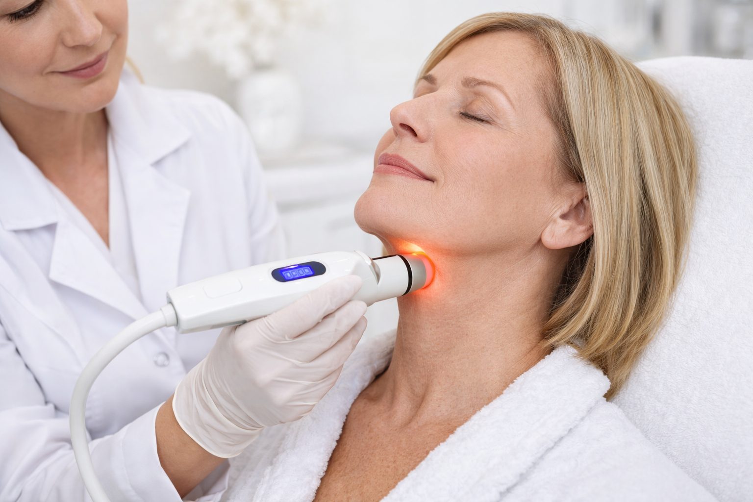 A targeted radiofrequency treatment designed to stimulate collagen and improve skin firmness in the neck and under chin area.